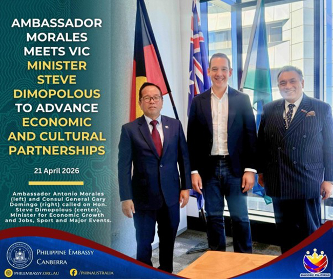 26 March 2026, CANBERRA – Philippine Ambassador H.E. Ambassador Morales met with Shadow Minister for Home Affairs and Immigration Senator Jonno Duniam to underscore the enduring contributions of the Filipino diaspora to Australia and to reaffirm the strength of Philippines-Australia relations.